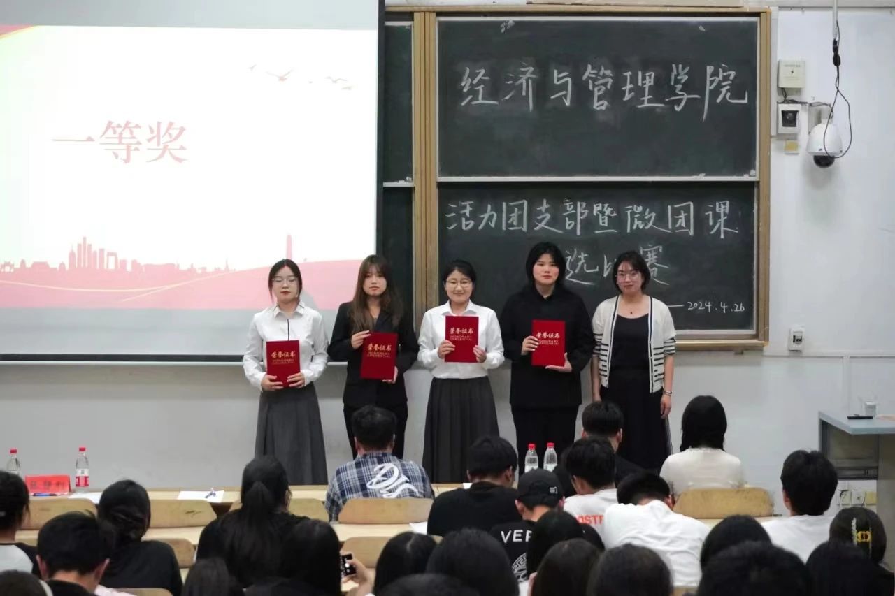 为深入学习贯彻习近平新时代中国特色社会主义思想和党的二十大报告精神,引导广大青年坚定理想信念,经济与管理学院于4月26日七点开展2024年度活力团支部暨微团课院级评选比赛。出席本次评选比赛现场的有经济与管理学院团委书记张静利、学生会主席李政、学生团委副书记孙恩光、韩杰洋、团委组织部部长李欣。