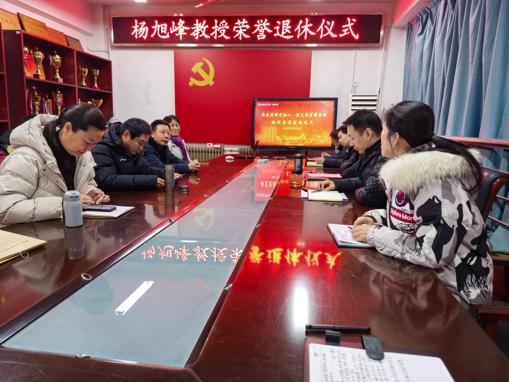 1月29日上午,体育教学部举行杨旭峰教授光荣退休仪式,部门班子成员、各教研室主任及教师代表参加了荣退仪式。仪式由体育教学部主任刘朝辉主持。