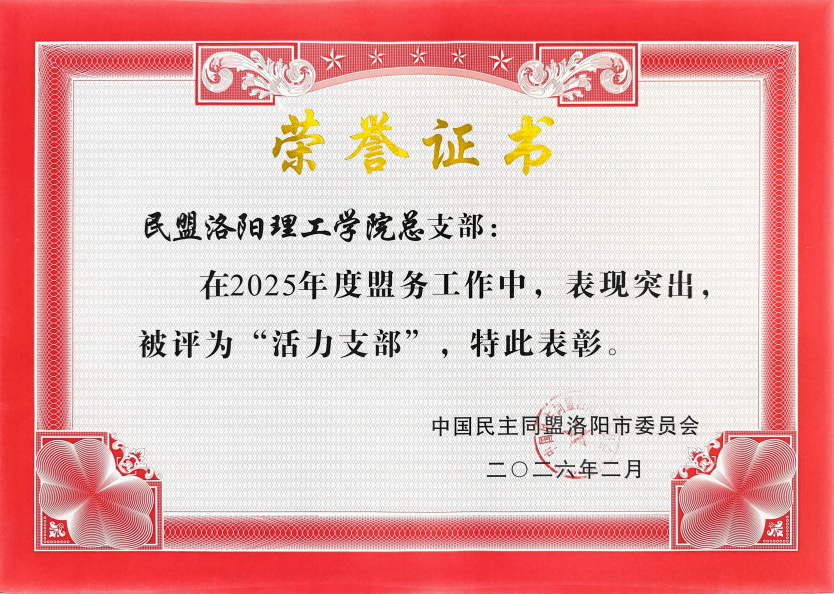近日,民盟洛阳市委对2025年度工作进行表彰,民盟洛阳理工学院总支因在盟务工作中表现突出,被授予“活力支部”荣誉称号,郭恒川、黄平、辛姝泓被评为“优秀盟员”,卢燕被评为“组织工作先进个人”,田甜被评为“宣传工作先进个人”。