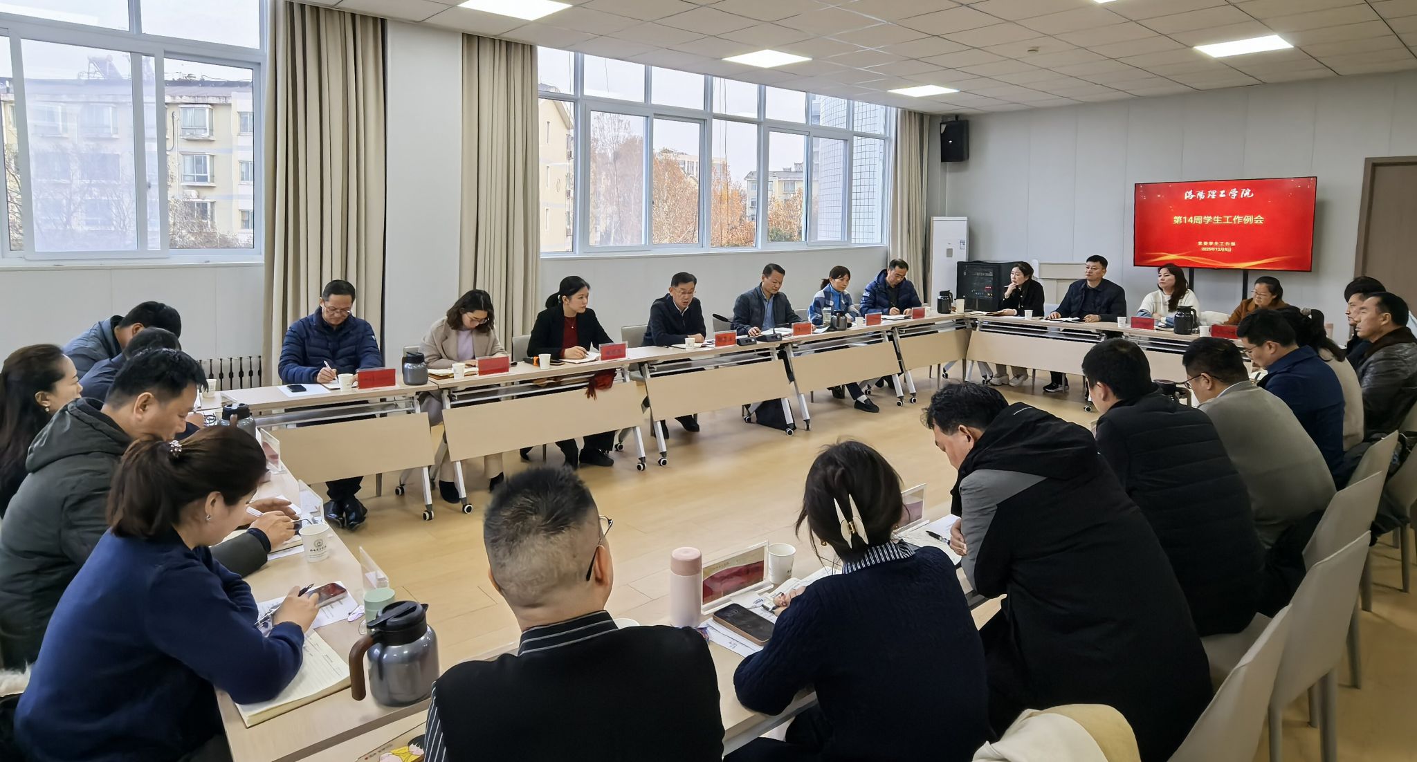 12月8日,我校在王城校区致新社区3楼会议室召开第14周学生工作例会。党委副书记胡恩立出席例会,学生工作处、校团委、心理健康教育中心、各校区“一站式”学生社区等部门负责人、各二级学院党委副书记等参加会议。会议由学生工作处处长杨勇主持。