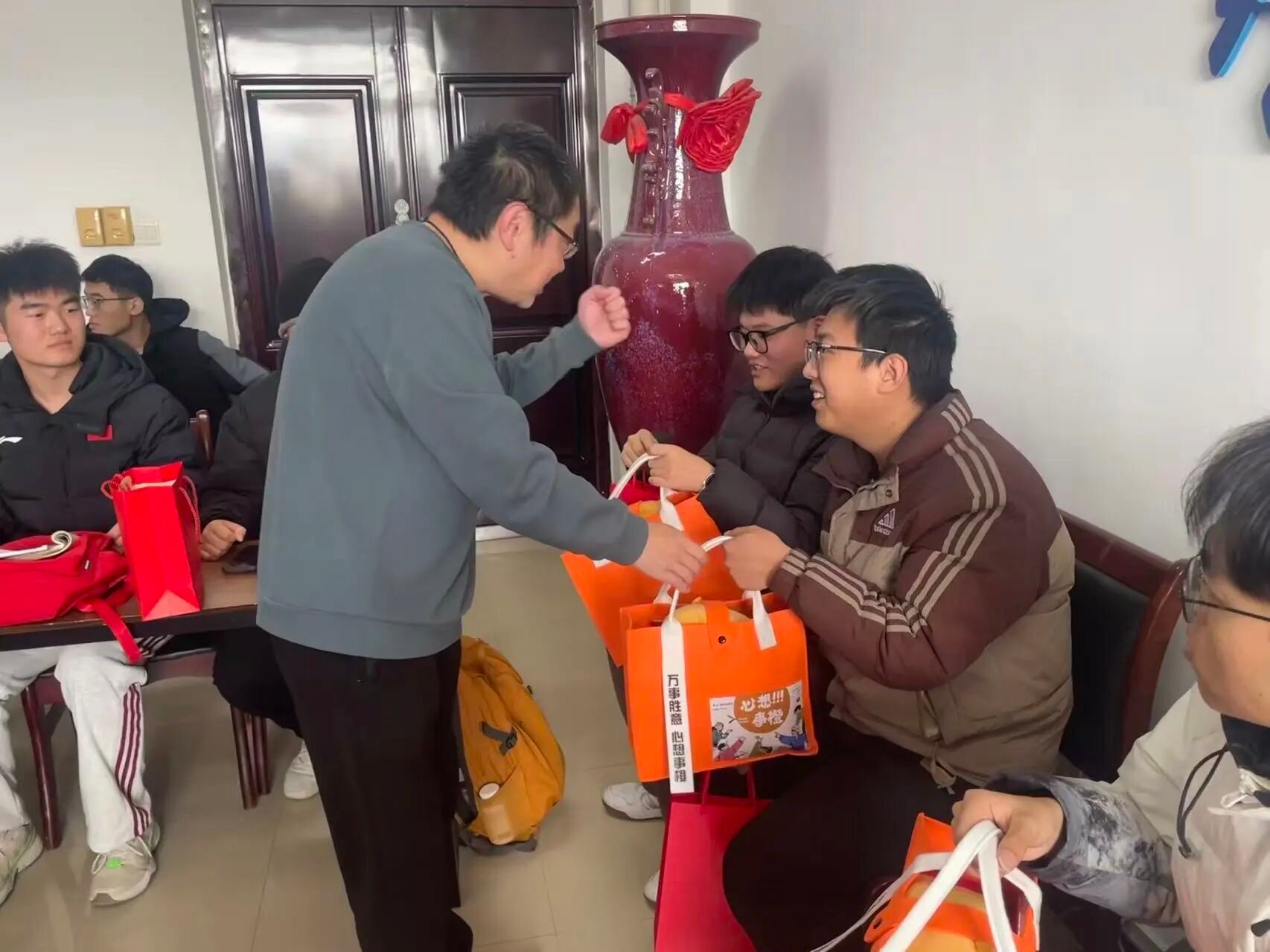 学院党委书记贺艺、院长朱德荣、党委副书记孟展、毕业班辅导员及资助专员等亲临现场,为同学们逐一发放考研礼包,并亲切询问大家的备考进展与生活近况。他们叮嘱同学们在冲刺阶段既要全力以赴,也要注意劳逸结合,保持积极平稳的心态,以最佳状态迎接考试。