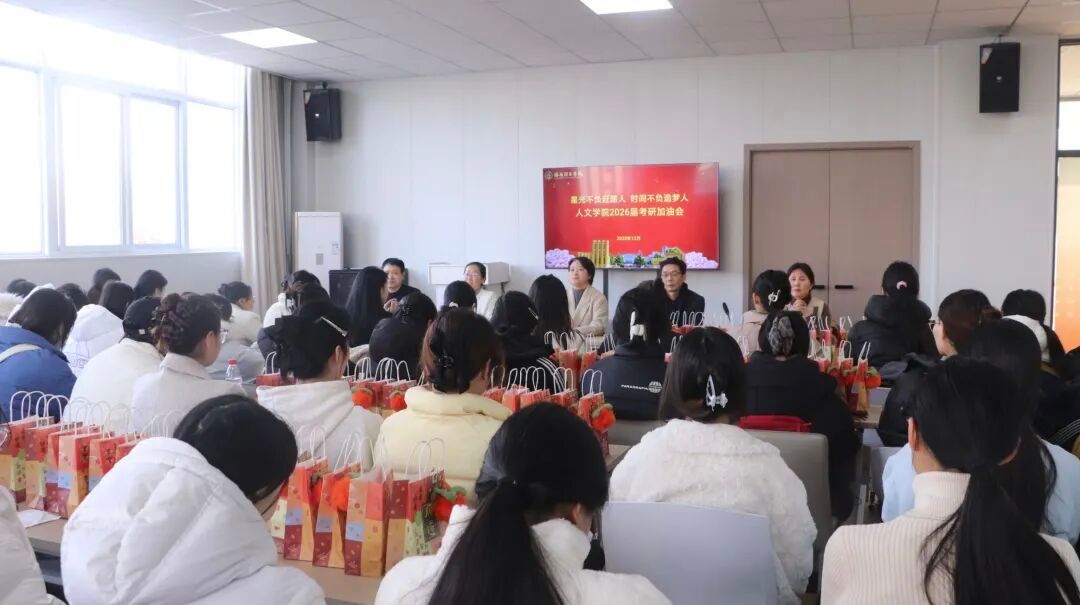 凛冬将至,2026年全国硕士研究生招生考试初试日益临近。为了缓解考研学子的考前压力与焦虑情绪,增强备考的底气与信心,致新社区人文学院于12月17日在致新社区三楼多功能厅举办以“星光不负赶路人,时间不负追梦人”为主题的考研加油会。学院党委书记张正瑞、院长张丽娜、党委副书记孙利丹、教学副院长刘余力、科研副院长陈朝阳及毕业班辅导员们出席本次活动,为2026届考研学子送上暖心的关怀与诚挚的备考祝福。本次考研加油会由党委副书记孙利丹主持。