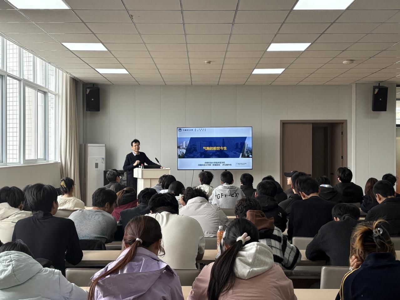 讲座现场,李纪远副主任结合自身丰富的临床经验与科研成果,从气胸的“前世”入手,详细讲解了气胸的病因的分类,包括自发性气胸、创伤性气胸等,重点分析了瘦高体型年轻人、有肺部基础疾病人群等高发群体的发病特点,结合临床案例拆解了肺大泡破裂等常见发病诱因,打破了大家对气胸“突发无因”的认知误区。李纪远兼顾专业性与通俗性,将复杂的医学知识与临床案例相结合,避免晦涩难懂的专业术语堆砌,让在场学生听得懂、记得住、用得上。学生们认真聆听、主动记录,在互动环节积极举手提问,针对气胸的复发预防、日常护理等疑问向专家请教,现场交流氛围热烈融洽。