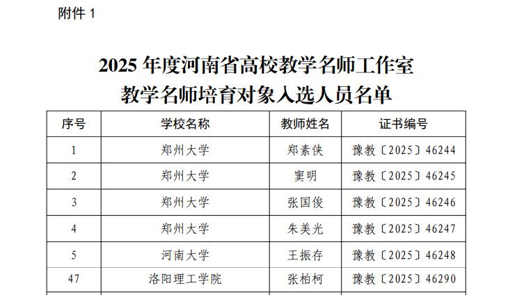 近日,河南省教育厅印发《关于公布2025年河南省高校教学名师工作室教学名师培育对象名单的通知》(教高〔2025〕231号),全省共评选出50名省级高校教学名师培育对象。我院张柏柯教授成功入选。