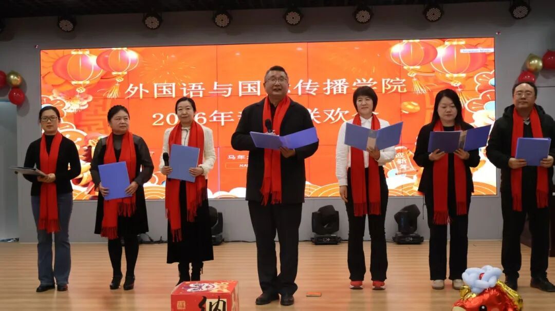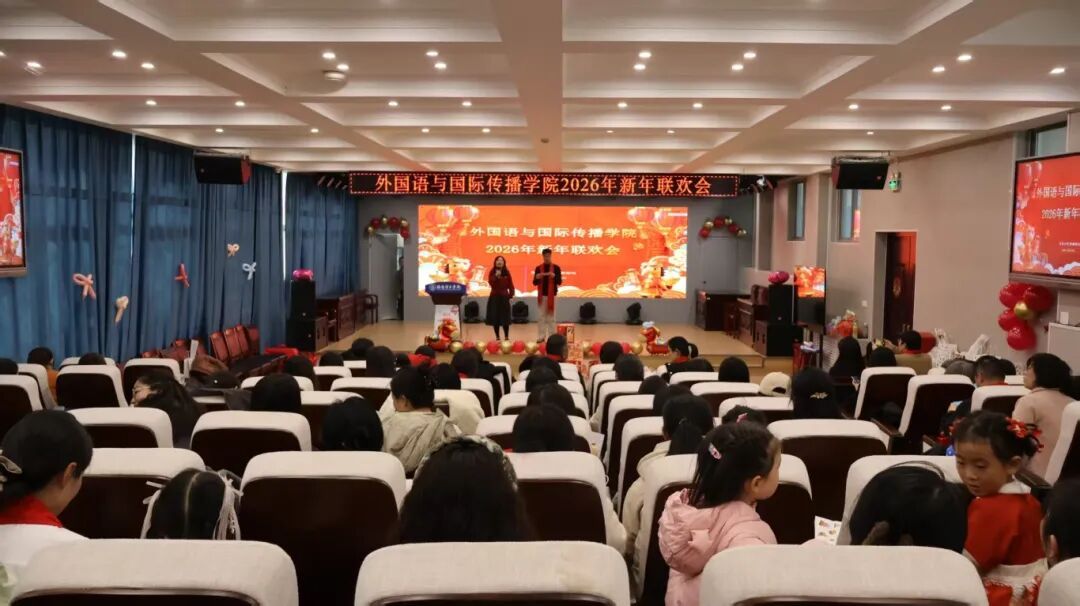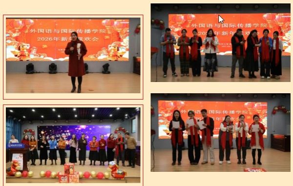 2026年1月16日下午,外国语与国际传播学院"同心聚力·共启新程"新年联欢会在XE206主会场温馨举行。学院全体教职工欢聚一堂,以自编自演的精彩节目共贺新春,共话发展。