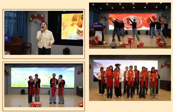 随后,老师们各展才艺,呈现了一场精彩纷呈的文艺盛宴。乔蓉老师一曲热情奔放的《最炫民族风》,以欢快的节奏和充满活力的演绎瞬间点燃全场气氛;商务英语系表演的舞蹈《中华全家福》以欢快灵动的舞姿展现了中华大家庭的喜庆祥和,充满希望的《一路生花》更是将现场氛围推向高潮;英语系老师们和声唱响“轻轻敲醒沉睡的心灵,慢慢张开你的眼睛”,熟悉的旋律里,流动的是对教育事业不变的赤诚与对崭新时光温柔的笃信。翻译系合唱的温暖人心的《小美满》温馨动人,韩慈红老师深情演绎的《知音》余韵悠长,大学外语二教研室合唱的经典歌曲《You Raise Me Up》旋律优美,传递着对未来的美好祝愿;最后,俄语系齐声唱响《新年快乐》,歌声中洋溢着对新年的美好祝福和对学院发展的坚定信心。