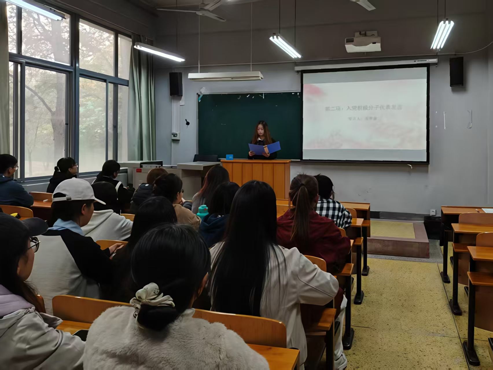 接下来由入党积极分子代表秦梦遥发言,她表示作为一名入党积极分子,要筑牢思想之基,保持谦逊态度,把握学习契机,践行党的宗旨,同时还要提升政治觉悟,锻造实干能力,以实际行动向党组织靠拢。