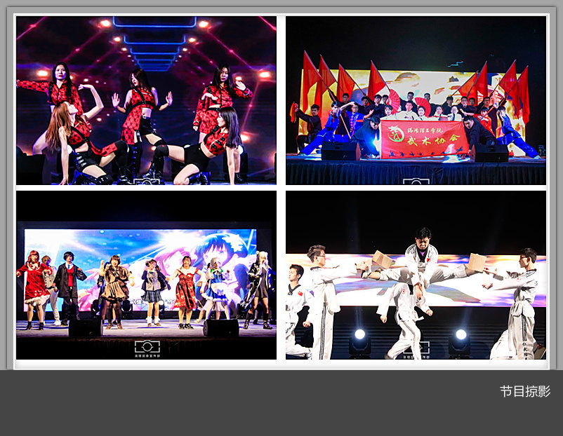 开幕式晚会节目由全校近90个社团推荐,最终精选出街舞协会、武术协会、跆拳道协会、相声小品协会、动漫协会等学校的明星社团带来的12个优秀节目进行了展示,充分展现了我校学生社团的教育教学成果,也给2020新生奉献了一场精彩欢乐的视听盛宴。晚会会场人潮如涌、热闹非凡,精彩的节目和现场的游戏互动,让场上气氛不断达到高潮。