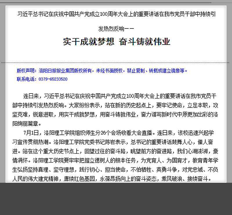 7月8日出版的《洛阳日报》第002版以《习近平总书记在庆祝中国共产党成立100周年大会上的重要讲话在我市党员干部中持续引发热烈反响— —实干成就梦想 奋斗铸就伟业》为题刊登我校党委书记陈岩的学习心得。