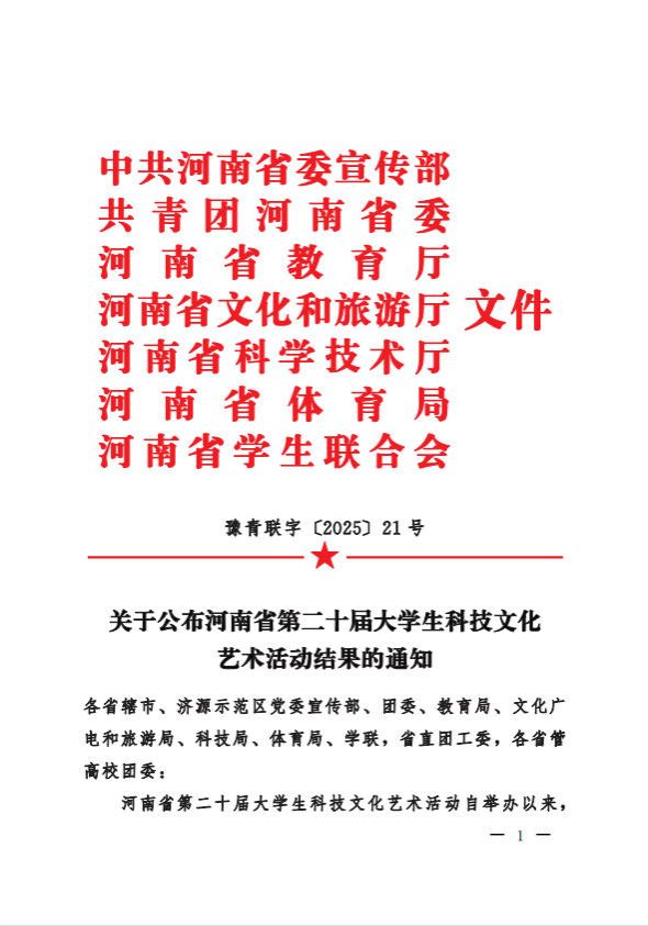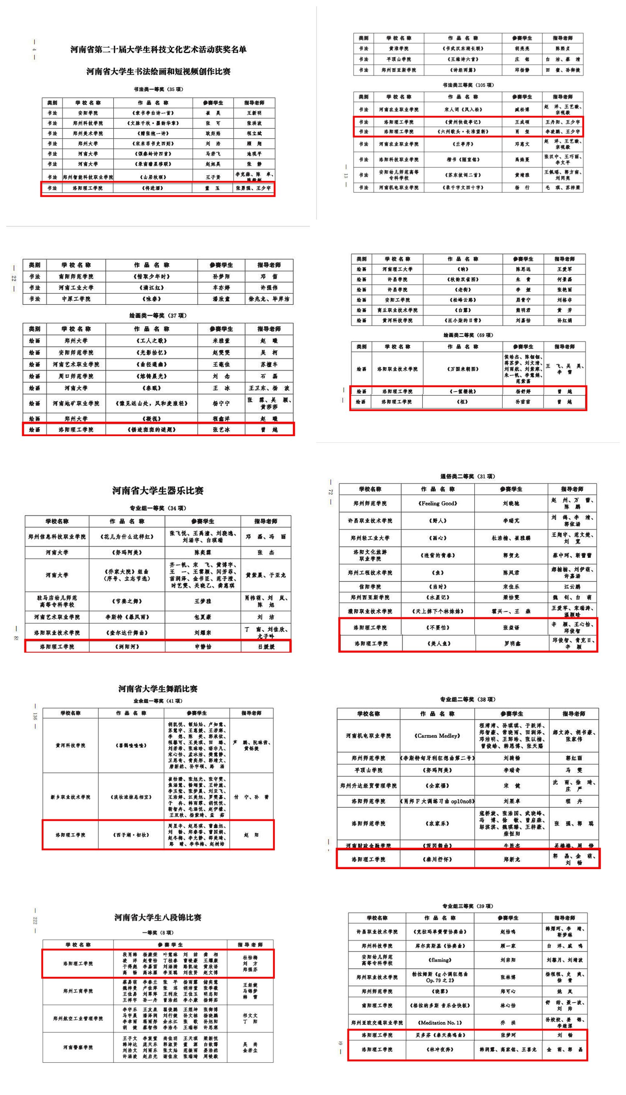 近日,由中共河南省委宣传部、共青团河南省委、河南省教育厅、河南省文化和旅游厅、河南省科学技术厅、河南省体育局及河南省学生联合会主办的河南省第二十届大学生科技文化艺术节公布比赛结果。我校学子在本届艺术节各项比赛中表现出色,共收获书法大赛一等奖1项、三等奖2项;绘画大赛一等奖1项、二等奖2项;歌手大赛通俗组二等奖2项;器乐大赛专业组一等奖1项,二等奖1项,三等奖2项;舞蹈大赛业余组一等奖1项;八段锦比赛一等奖1项。