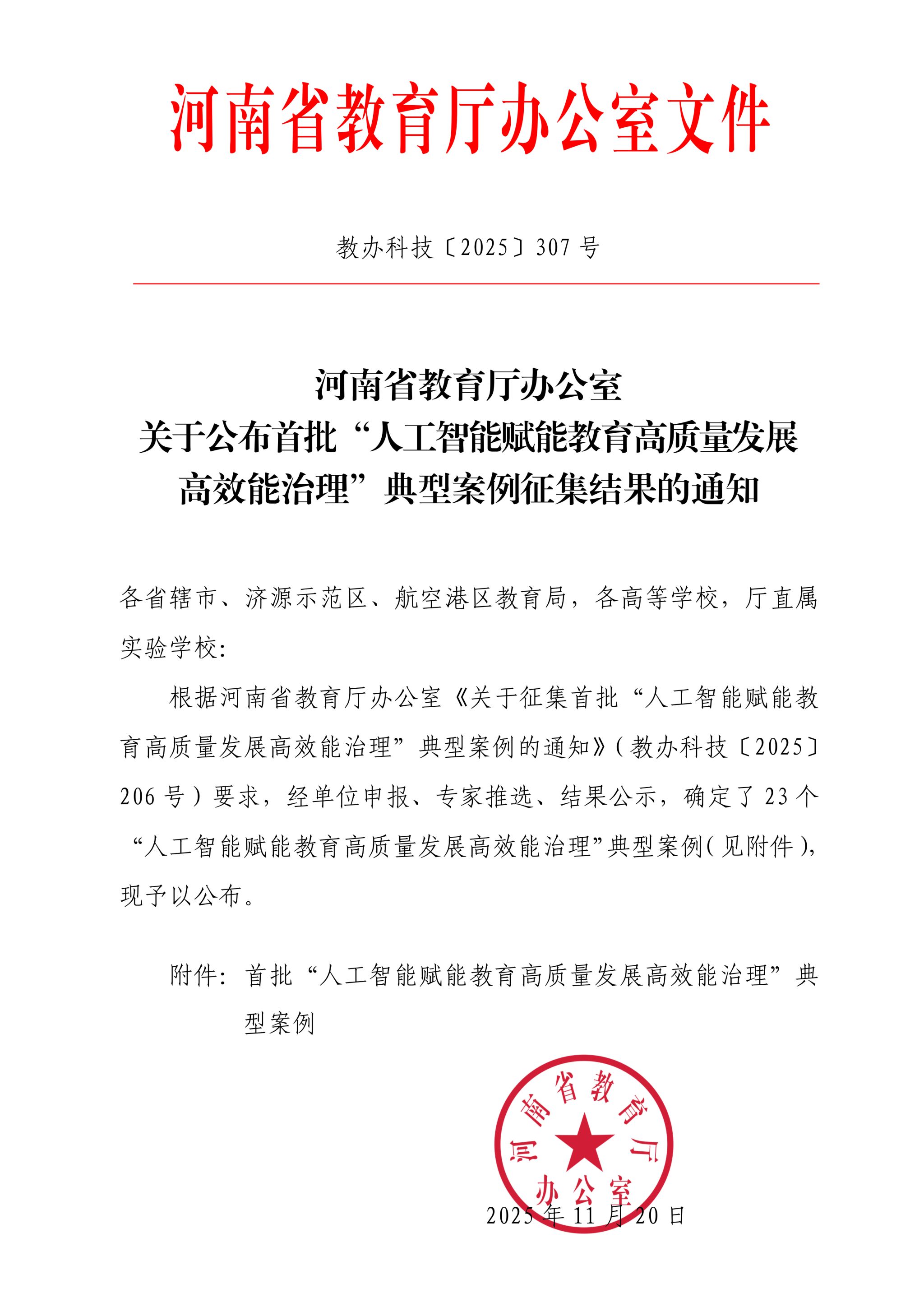 近日,河南省教育厅办公室印发教办科技〔2025〕307号文件,公布首批“人工智能赋能教育高质量发展高效能...