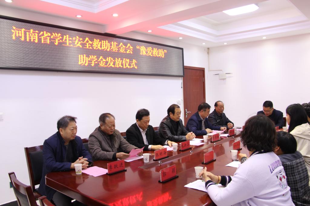2019年11月6日上午,河南省学生安全救助基金会“豫爱救助”助学金发放仪式在我校在王城校区大学生服务中心106会议室举行。河南省学生安全救助基金会洛阳服务中心主任李勇灿、副主任毛新喜、顾问郭朝卿、李跃进,以及我校工会副主席张明海、学生工作处处长张宽亮、学院辅导员代表和受助学生参加了发放仪式。