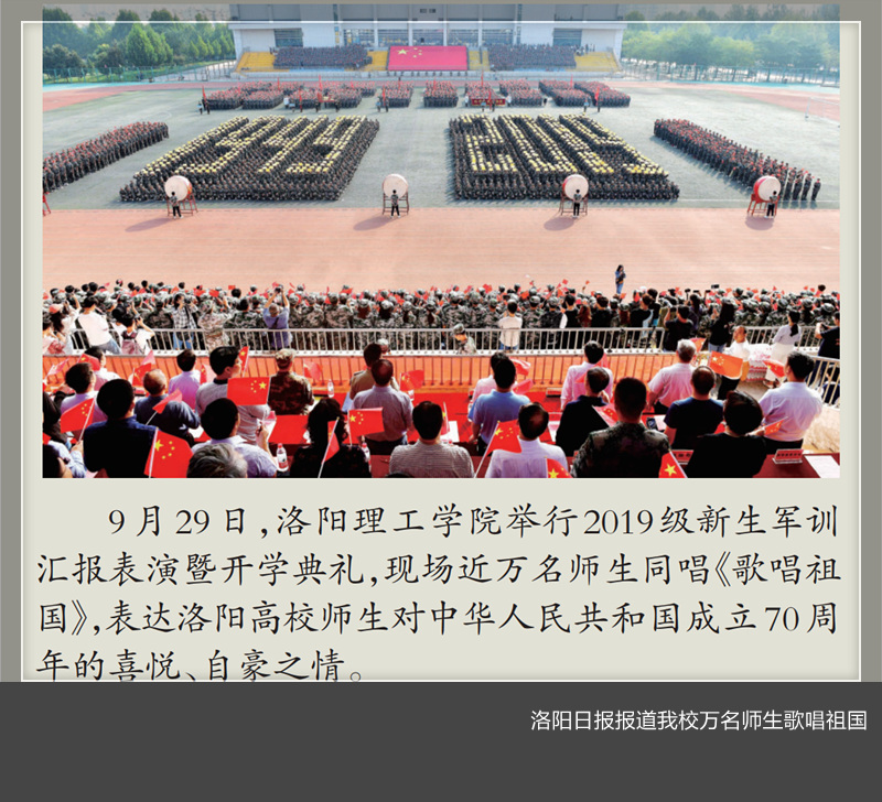 10月1日出版的洛阳日报第4版以《壮丽70年放歌新时代》为题对我校2019级新生军训汇报暨开学典礼上万名师生同声高唱《歌唱祖国》予以报道。