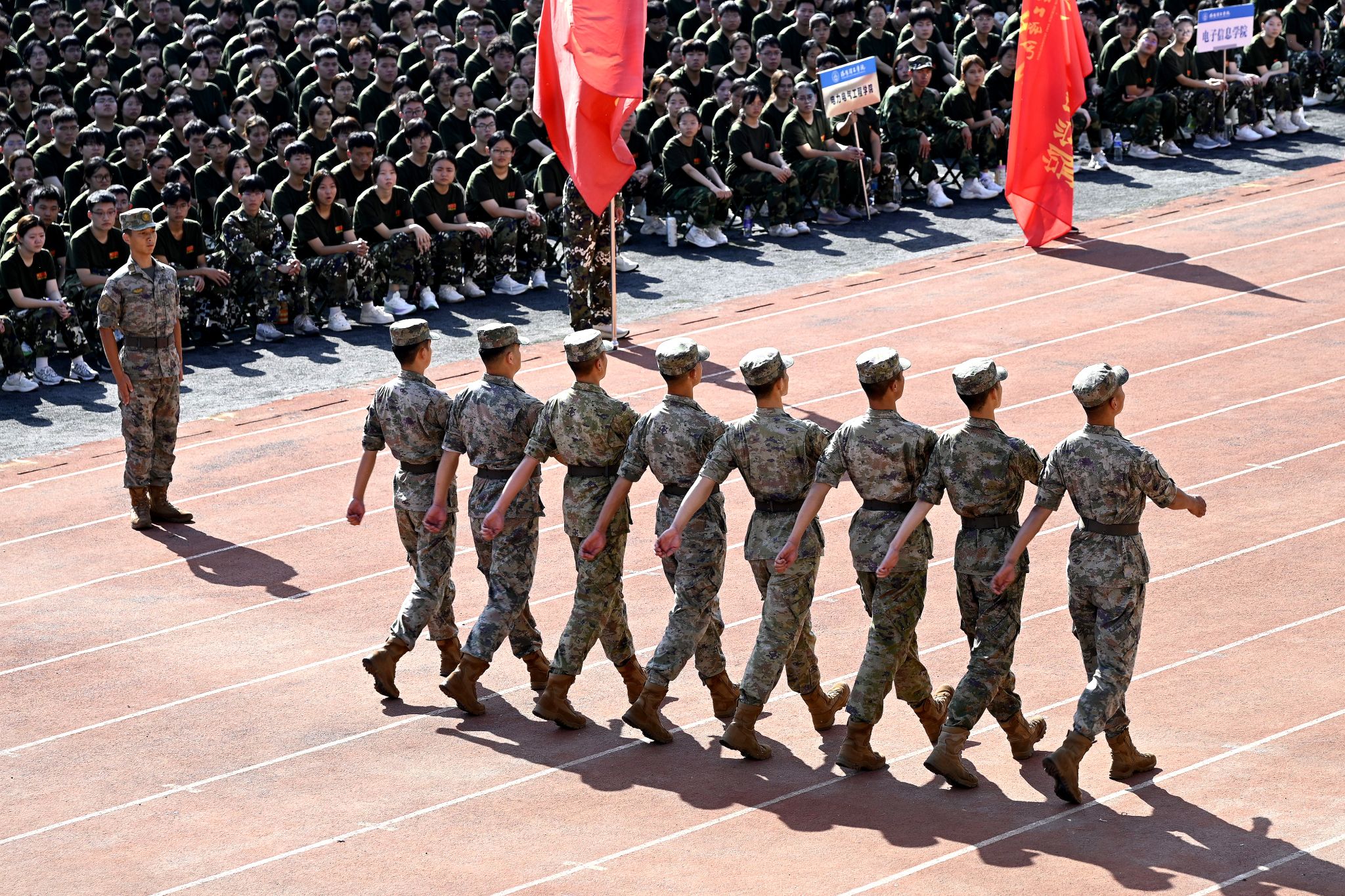 参加纪念中国人民抗日战争暨世界反法西斯战争胜利80周年阅兵式的中国人民解放军某部官兵为现场师生展示单个军人队列动作。