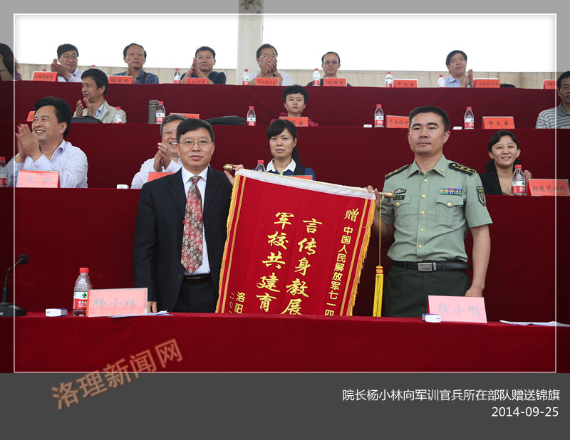 学校领导为获奖的系部颁奖。院长杨小林教授向军训官兵所在部队赠送锦旗。