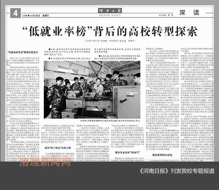 10月30日,《河南日报》第4版《深读》专栏大篇幅报道我省首批高校转型发展试点院校的转型探索,以我校转型发展为典型深度解读高校应对就业难问题的转型发展和实践探索。 内容如下: 新闻链接: http://newpaper.dahe.cn/hnrb/html/2014-10/30/content_1168470.htm?div=0