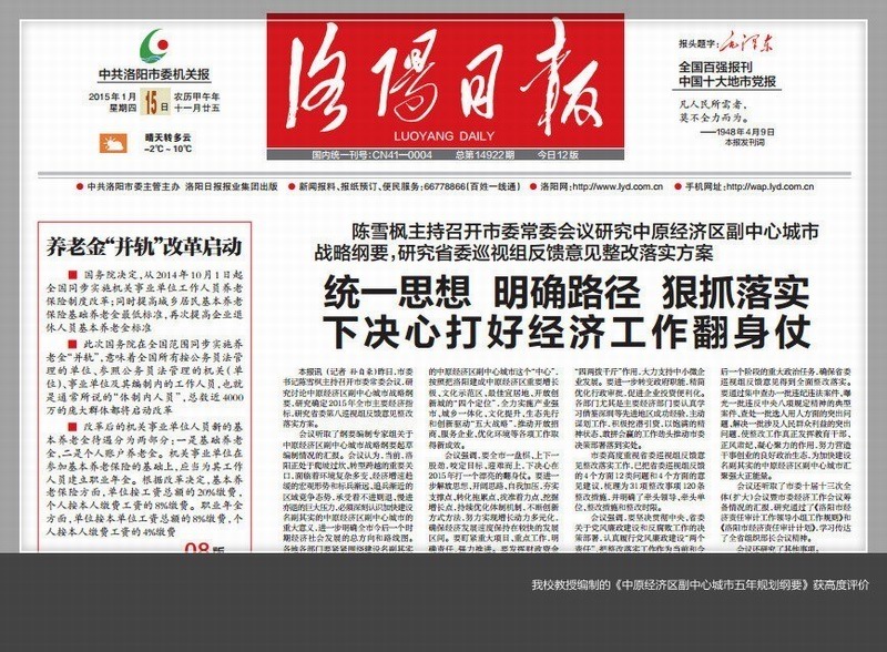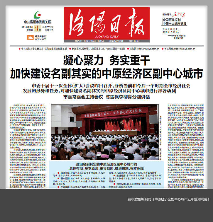 2014年9月,由我校经济与管理学院胡延松教授组建的课题组承担了中原经济区副中心城市五年规划的编制工作。经过半年的研究工作,课题组完成了3.5万字的《中原经济区副中心城市五年规划纲要》。纲要系统分析了建设中原经济区副中心城市的背景和意义,明确提出了建设目标、基本定位及发展战略。目前,该规划已经向洛阳市委常委会议进行汇报,得到陈雪枫书记及与会领导的高度认可。