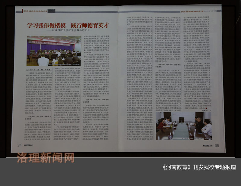 日前,《河南教育》(高教版)第5期以《学习张伟做楷模 践行师德育英才——访洛阳理工学院党委书记苟义伦》为题刊发了我校在全院开展“学习张伟,践行焦裕禄精神”师德主题教育活动开展情况和我校 “四学四做”和“五个结合”的做法。