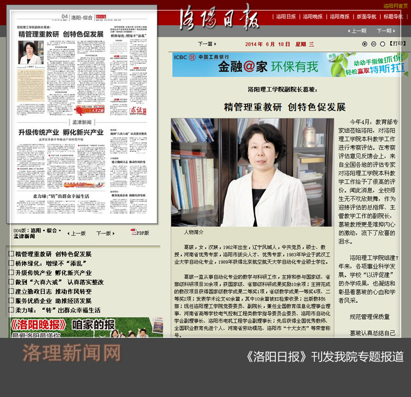 6月18日,洛阳日报第4版“洛阳·综合”栏目以《洛阳理工学院副院长葛玻: 精管理重教研 创特色促发展 》为题专题报道了我院副院长葛玻同志事迹。 详情点击:http://lyrb.lyd.com.cn/html/2014-06/18/content_1216611.htm