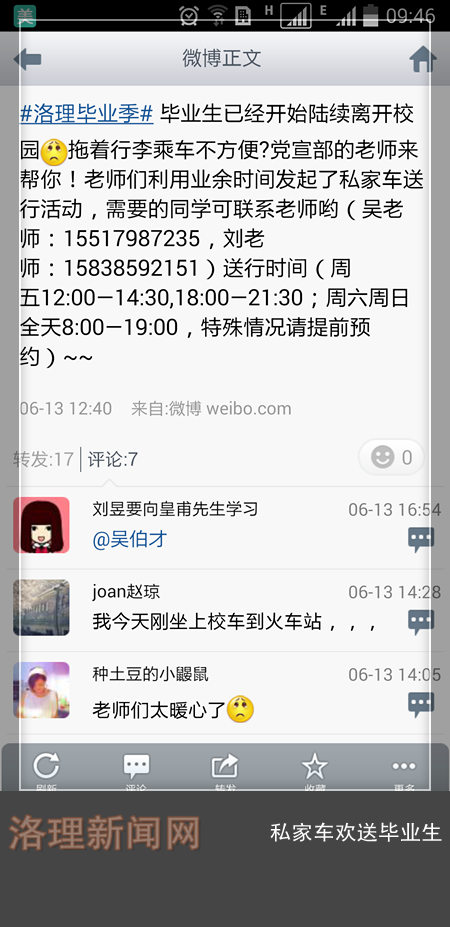 为了做好2014届毕业生离校工作,日前,我校安排专车分王城校区、开元校区、九都校区三个校区送毕业生去洛阳火车站,同时院团委组织青年志愿者联合会设服务站,欢送毕业生离校。 党委副书记陈岩代表学校看望了即将踏上新征程的毕业生同学,祝他们旅途一路顺风,更希望毕业生同学在今后的工作学习中能常回母校看看。毕业生们纷纷表示,学校对毕业生人性化、细致化、规范化的服务,让他们感到身为洛理人的自豪,今后无论走到哪里,永远会心系母校。