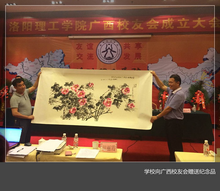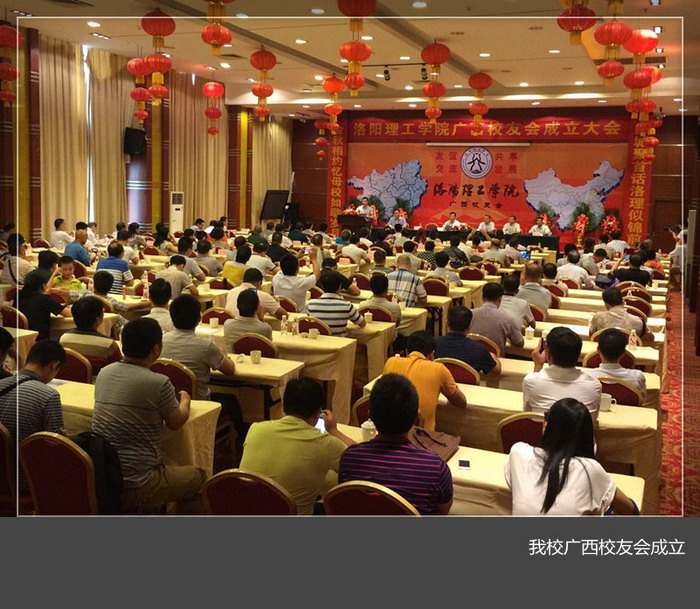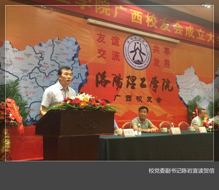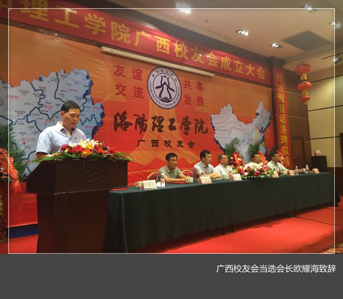 学校党委办公室主任韩洪涛宣读了《洛阳理工学院关于成立广西校友会的批复》,8321班校友、广西玉林第一建筑安装工程公司董事长吴家让致欢迎词,96532班校友、北京龙安华诚建筑设计有限公司副总经理谢迪介绍了广西校友会的筹备过程。大会举手通过了《洛阳理工学院广西校友会章程》、第一届组织机构建议人选。大会选举吴家让为名誉会长,8522班校友、广西南宁浮法玻璃有限责任公司总经理欧耀海为会长,梁少豪为常务副会长,吴格云、温贤伟、施丽霞、王景元、梁忠、张燕来、吴锋、张化民等担任副会长,谢迪担任秘书长,刘绵森、沈福传、粟小聪、蒙政部、刘丰球、梁泽来、黄锐、雷均、马燕等担任副秘书长,大会还选举通过了秘书、会计、出纳等。