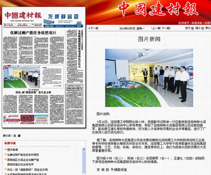 6月9日,《中国建材报》以图片新闻的形式报道了我校领导在陕西校友会成立之际,到尧柏特种水泥集团有限公司参观考察。详情衔接:http://www.cbmd.cn:85/content/2014-06/09/content_18792.htm