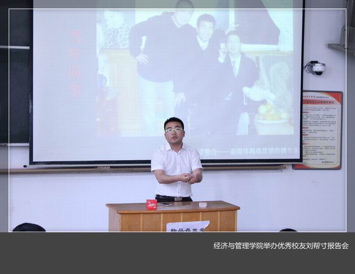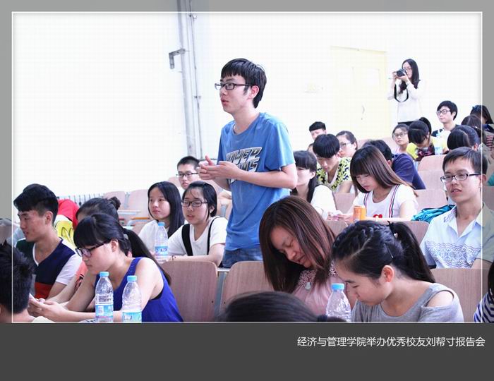 2015年6月11日下午,经济与管理学院在开元校区教学B楼举办“奋斗的青春最美丽—优秀校友刘帮寸报告会”。 经济与管理学院分团委书记、辅导员老师和各专业学生100多人参加了报告会。