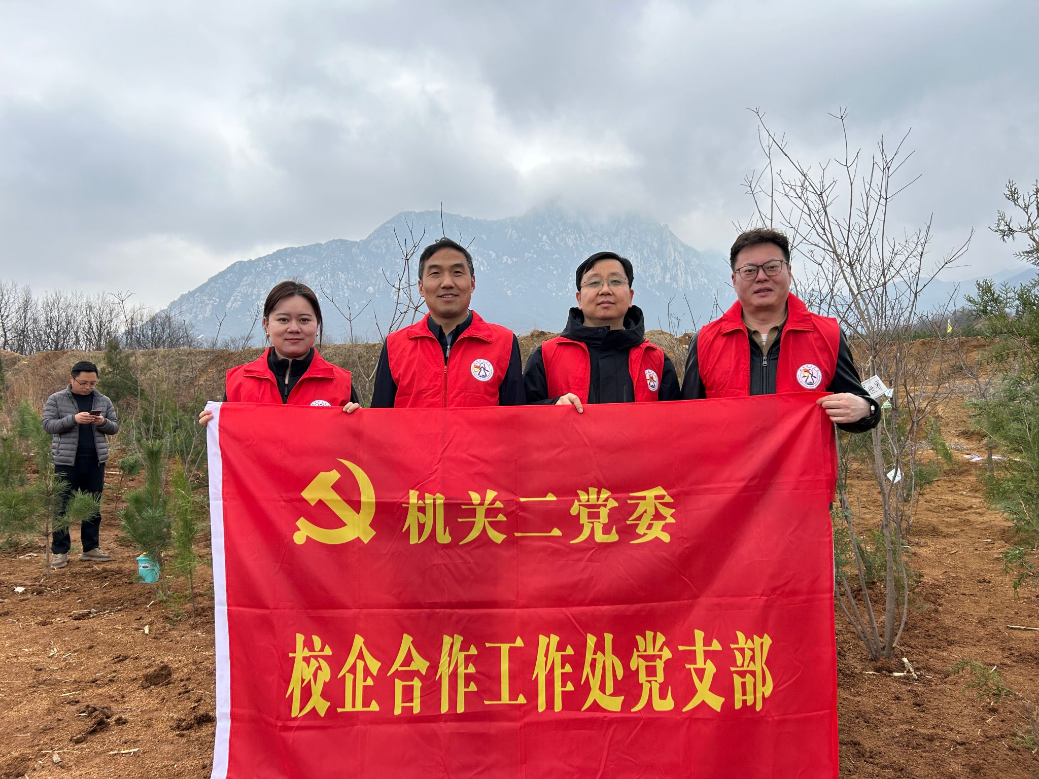 阳春三月,万物复苏,嵩山脚下春意盎然,植绿护绿恰逢其时。为深入践行“履行植树义务,共建美丽中国”植树节主题,强化党员生态环保意识与责任担当,3月15日,机关二党委校企合作工作处党支部全体党员、校友工作志愿服务团学生代表,赴登封市石道乡陈家门村“互联网+全民义务植树基地”开展“我为生态添绿,我为党旗添彩”主题党日活动。