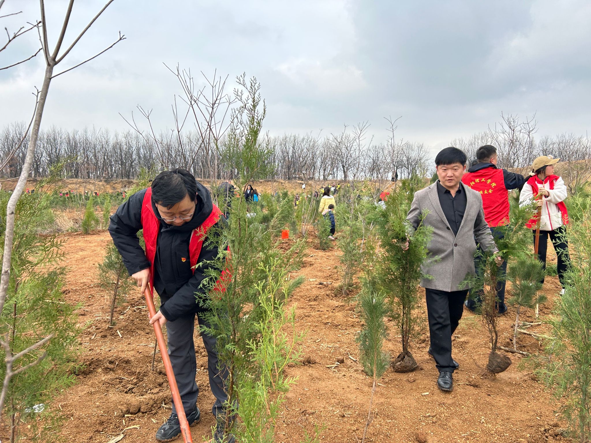 活动现场暖意融融、氛围热烈,党员同志们与学生代表精神饱满、干劲十足。在基地工作人员的专业指导下,大家迅速明确分工、密切配合,严格按照植树规范流程操作:挥锹铲土、扶正树苗、回填压实、浇灌定根水,大家分工协作、配合默契,原本空旷的山坡上,一棵棵新苗迎风挺立,一幅生机盎然的“党建+生态”春种画卷徐徐铺展。