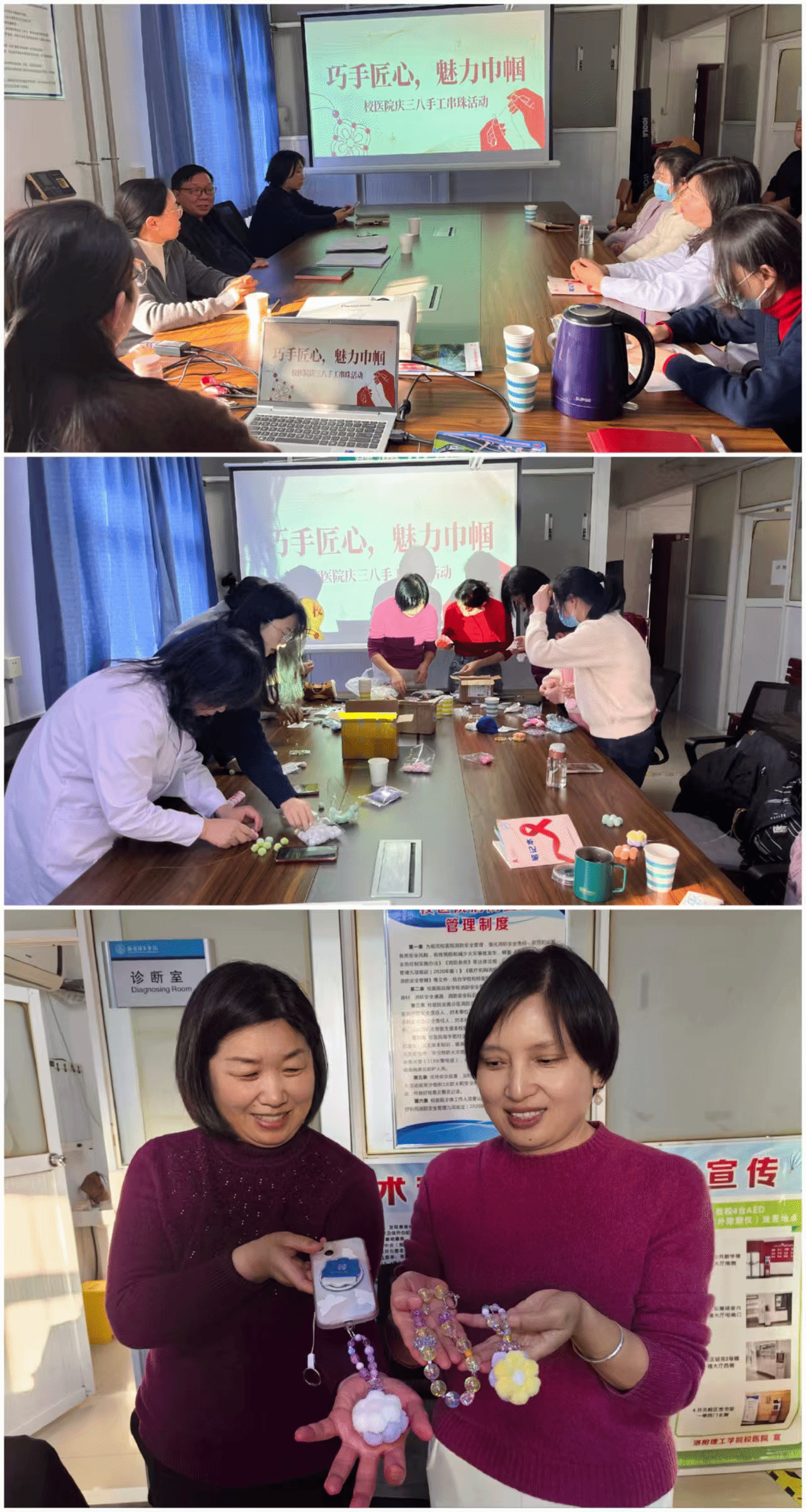 为庆祝 “三八” 国际劳动妇女节,丰富女职工精神文化生活,展现医务巾帼风采,3月5日下午,校医院举办“巧手匠心,魅力巾帼”手工串珠活动。