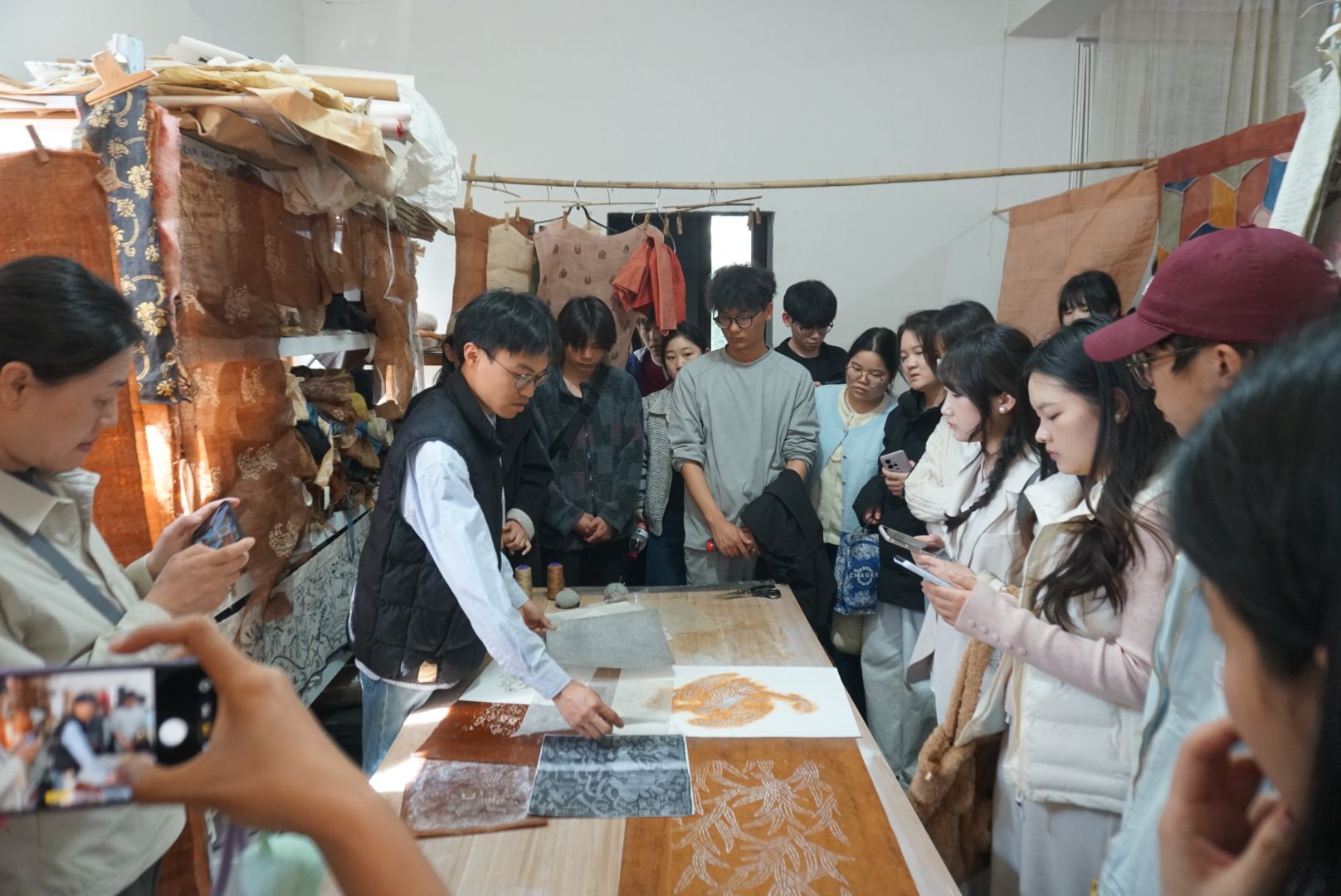 在杭州谢太傅印染工艺社,同学们近距离观摩植物染、蓝印花布等传统印染技艺,感受年轻匠人赋予传统工艺的新生。中国丝绸博物馆的参观帮助大家贯通了从古代丝路到现代丝绸科技的完整脉络。在凌迪科技,3D数字设计、虚拟样衣等数字技术让同学们见证了科技如何赋能传统纺织产业。