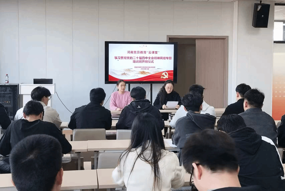 为深入学习领会习近平总书记关于中国式现代化的重要论述,准确把握党的二十届四中全会精神的核心要义,教育引导广大学生党员切实把思想和行动统一到党中央决策部署上来,我院学生党支部于3月20日在致新社区三楼多功能厅举行了河南党员教育“云课堂”——学习贯彻党的二十届四中全会精神网络专题培训班开班仪式。党支部书记李梦琪、宣传委员宗雪婷及全体学生党员参加。
