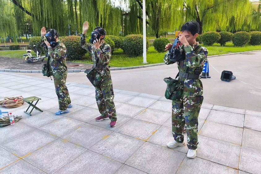 广场上,教官通过真人示范与分步讲解,将防毒面具使用知识转化为易懂实用的操作技能。