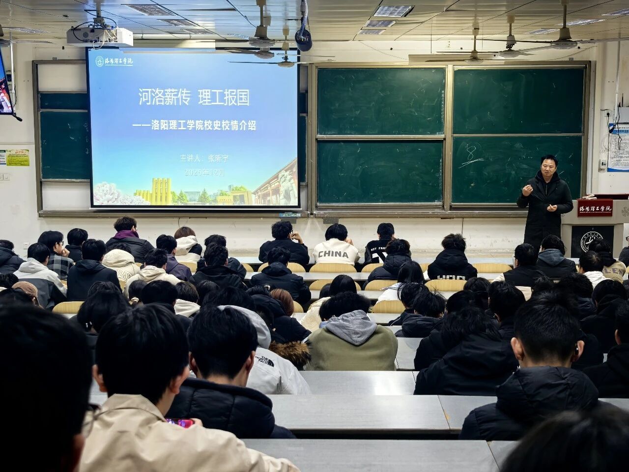 沐河洛清风,承学府薪火。为切实厚植大一新生的爱校荣校意识,助力新生更好地融入校园、明晰成长方向,2025年12月24日19:00,我院于AE101教室举办主题为“ 河洛薪传 理工报国 ”的校史教育讲座。讲座特邀图书馆副馆长张昕宇担任主讲,学院党委副书记曲振峰主持本次活动。