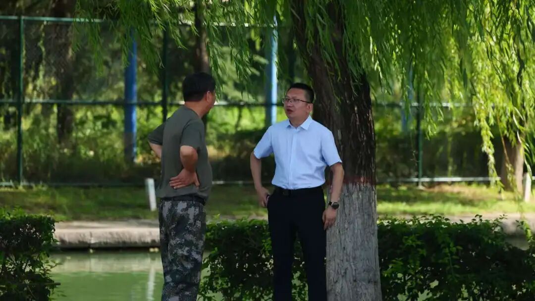 军训场上,既有教官们专业细致的指导,更有老师们温暖坚实的陪伴。学院党委书记邱晓嘉与学院党委副书记曲振峰亦亲临训练场视察军训工作,他们一边关切地查看同学们的训练状态与进展,了解训练成效;一边心系学子安全,时刻关注现场情况,做好应对各类突发状况的准备,以实际行动为军训的顺利开展保驾护航。