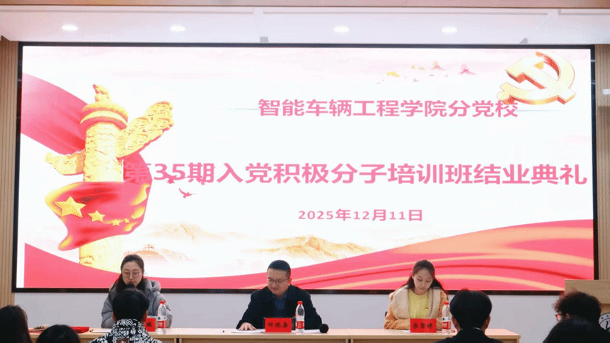 12月11日 17:00,智能车辆工程学院第三十五期入党积极分子培训班结业典礼在CS203隆重举行。学院党委书记、分党校校长邱晓嘉,学工办主任宗雪婷出席典礼,18 名参训学员齐聚现场,共同见证这一重要时刻。仪式由分党校班主任李梦琪主持。